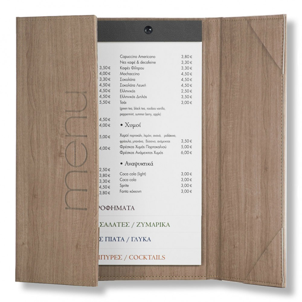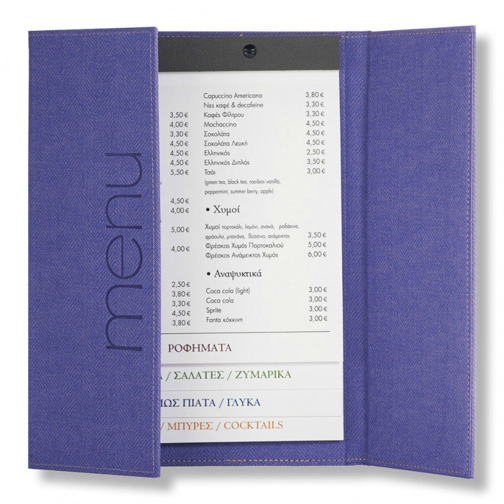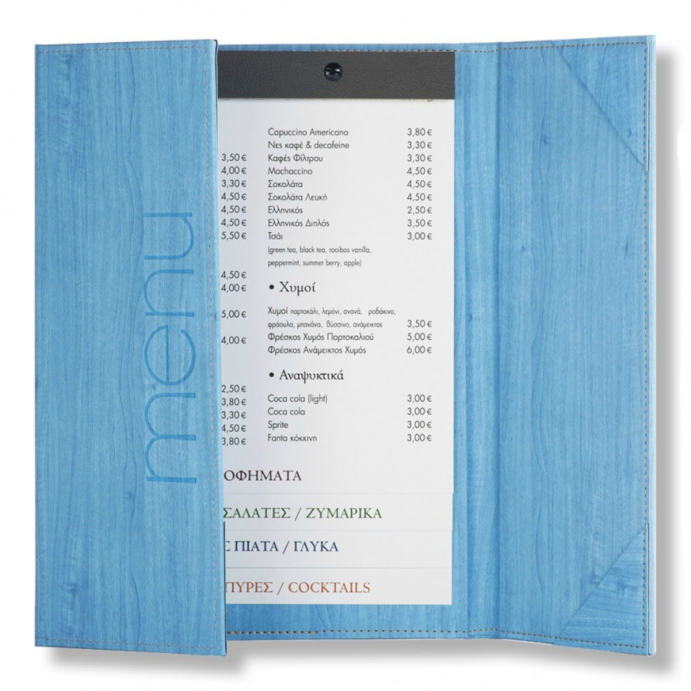 3fold menu catalogue, for 3 page placement Manufactured with corners for easy page addition and remo..