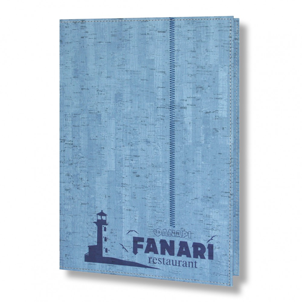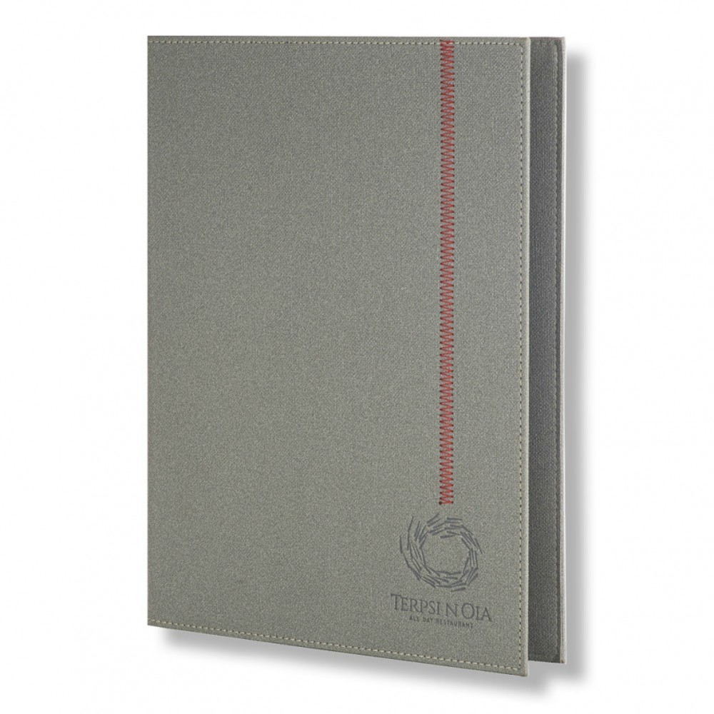 Menu catalogue Olympia, with short or long zig zag decorative stitching that ends up in your logo