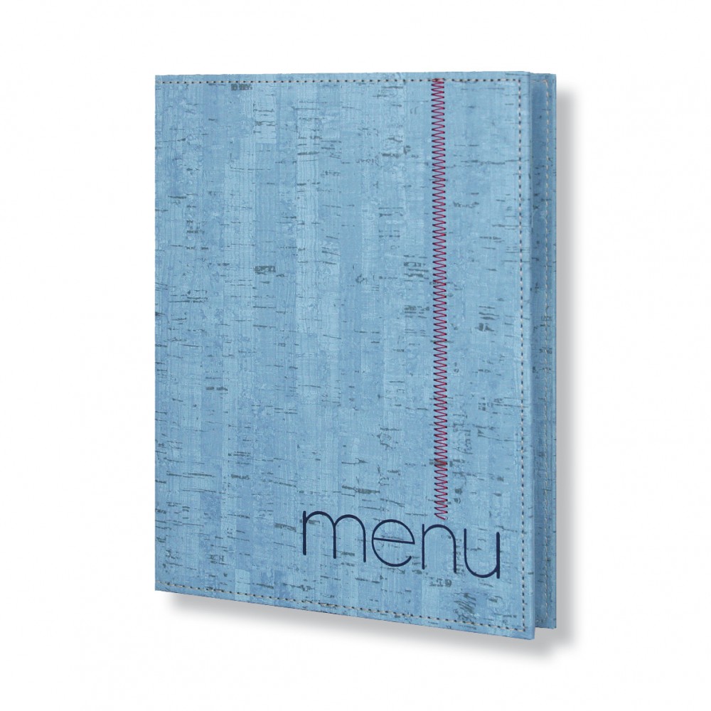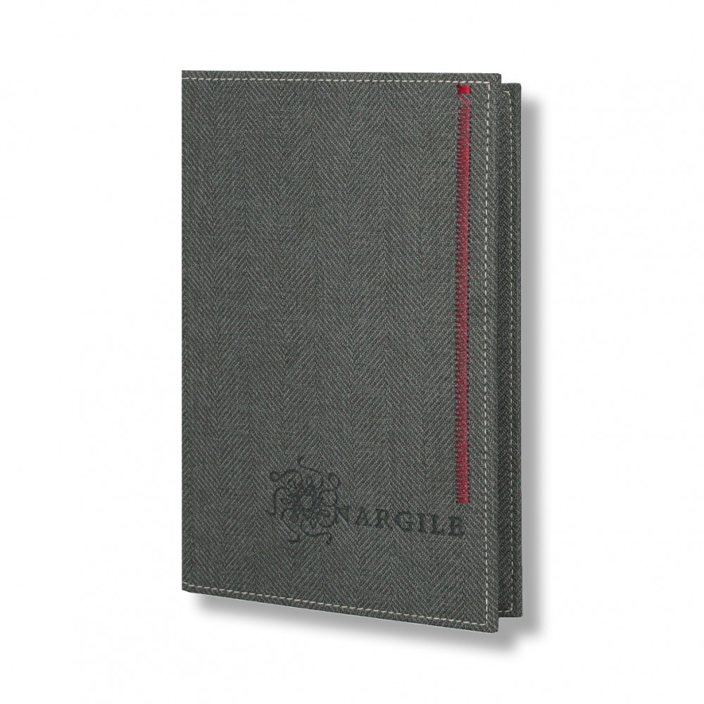 Menu catalogue Olympia, with short or long zig zag decorative stitching that ends up in your logo By..