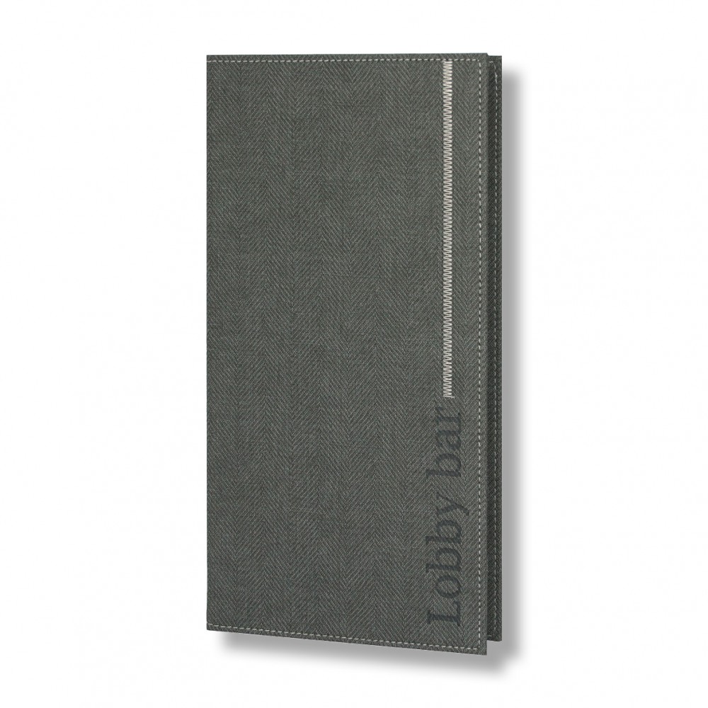 Menu catalogue Olympia, with short or long zig zag decorative stitching that ends up in your logo By..